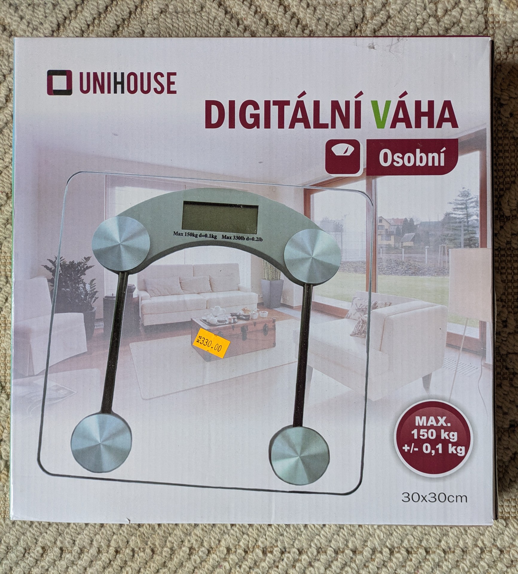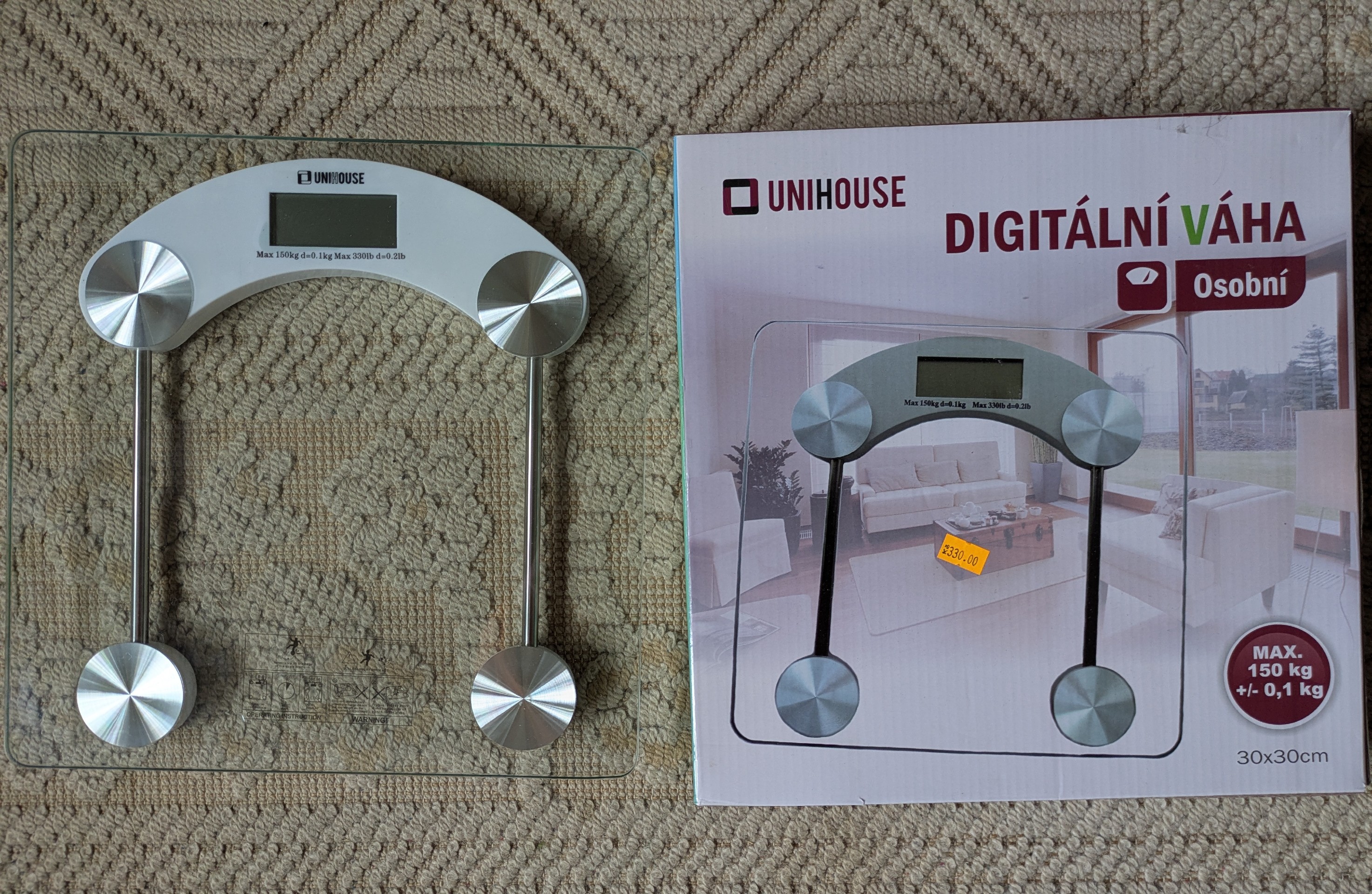 Prodám osobní digitální váhu Unihouse o rozměrech 30×30cm, váží do 150 kg, s integrovaným teploměrem. Možnost přepínání mezi "kg" a "lb"