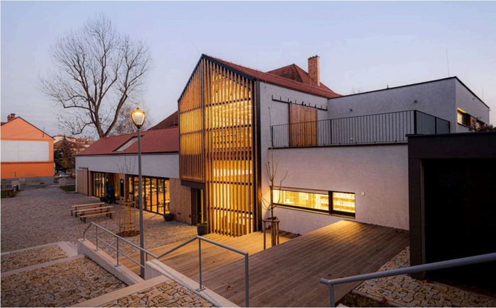 Uvnitř je kromě knihovny také restaurace a před ní dlážděná plocha, využívaná pro společenské účely. Dál už následuje zeleň. Právě polyfunkčnost stavby ocenil také Klub Za starou Prahu. „Oceňujeme její funkční náplň, která se neomezuje jen na knihovní provoz, a budova se tak díky ní stává skutečným společenským centrem malého města,“ upřesňuje Rostislav Švácha, historik architektury a jeden z organizátorů ceny. Porota na stavbě dále ocenila správně zvolené měřítko a nápaditou práci s napůl tradičními a napůl moderními formami. Do finále 19. ročníku Ceny Klubu Za starou Prahu postoupilo sedm staveb. Na seznamu se objevila například dostavba budovy jatek pro galerii Plato v Ostravě, obecní dům ve Skaličce u Tišnova nebo Městská knihovna ve Vratislavicích nad Nisou. Všechny z těchto realizací jsou nyní nominovány také na Českou cenu za architekturu. K překryvům mezi cenami dochází pravidelně. Před třemi lety například téměř současně udělily nejvyšší ocenění sídlu firmy Lasvit v Novém Boru.